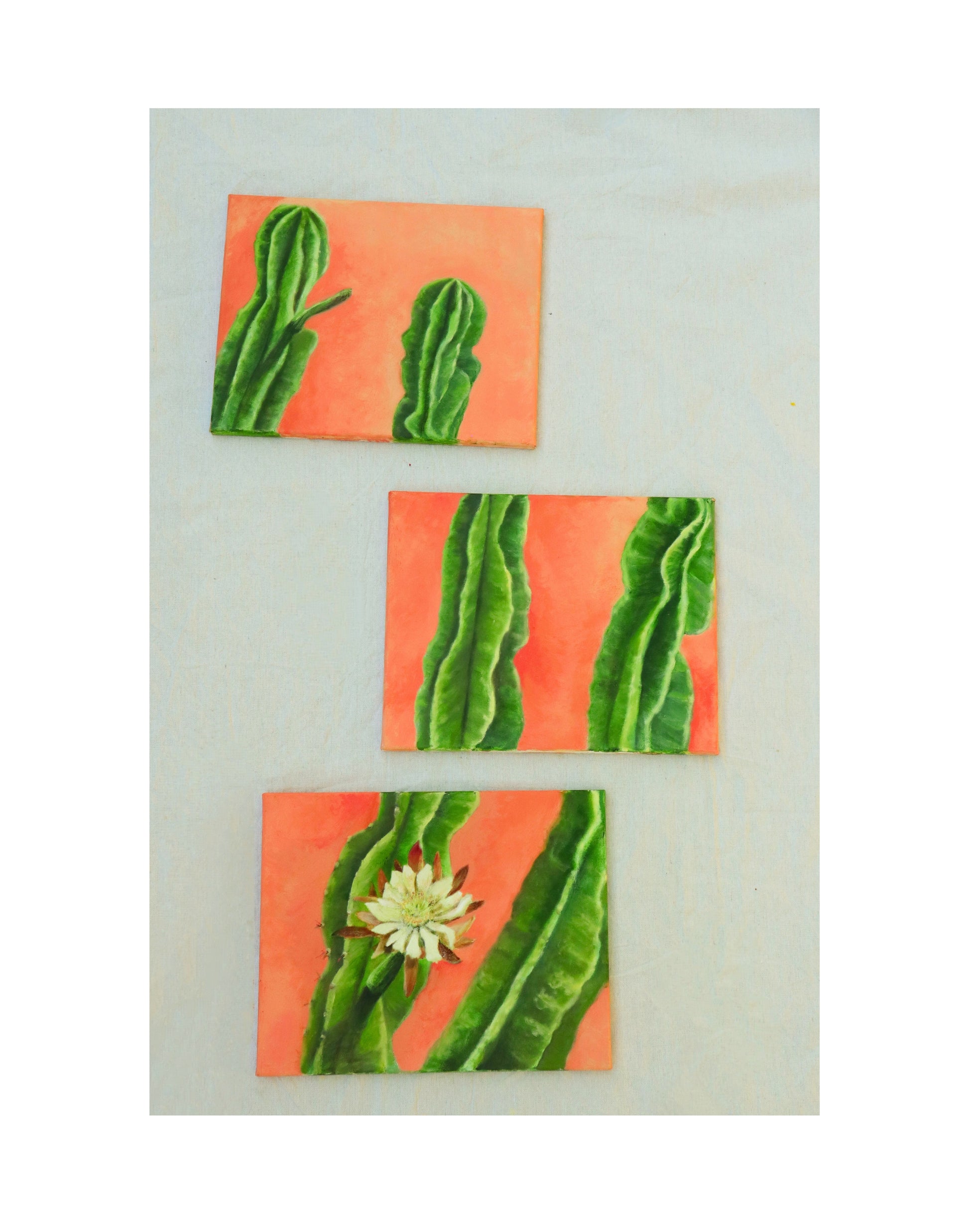 Cactus undulates up 3 panels of canvas, with an open flower and a closed bud. Oil on canvas. Each canvas size is 11" x 14".