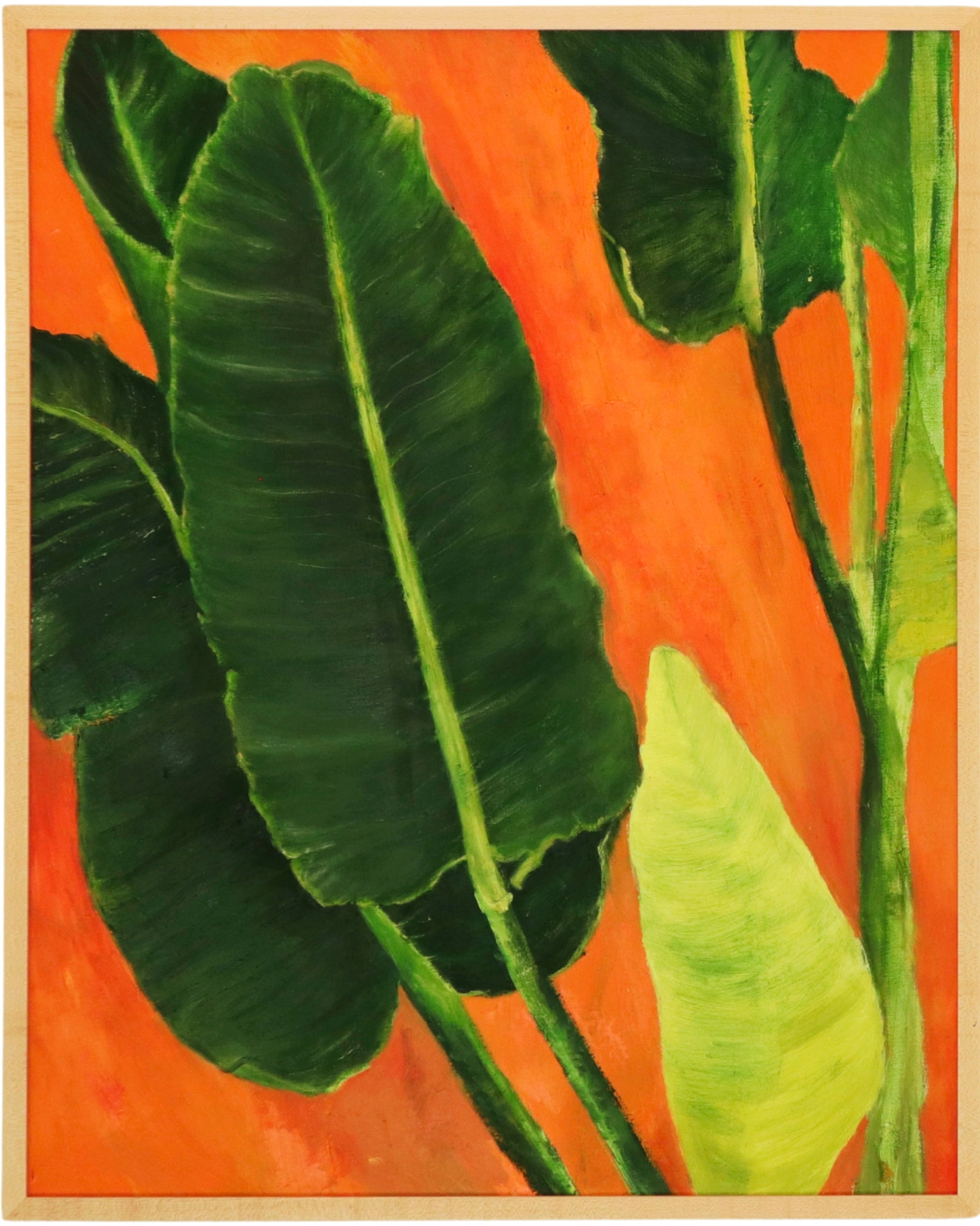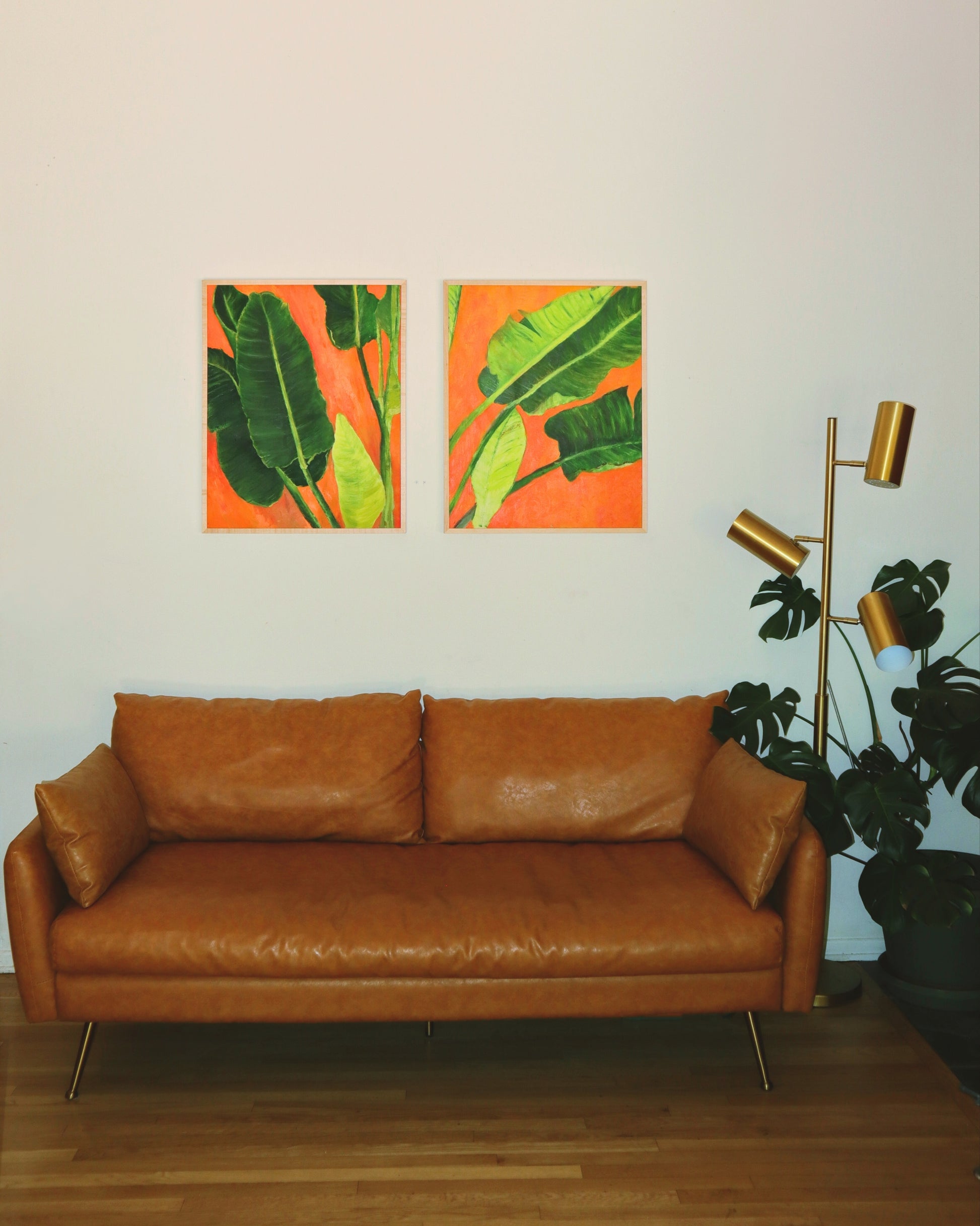 Banana leaves painted against an orange background. The baby and new leaves flow across the bright orange canvas, bringing nature into the room in a vibrant, playful way. Each canvas is 24" by 30". Framed. Priced for both paintings.