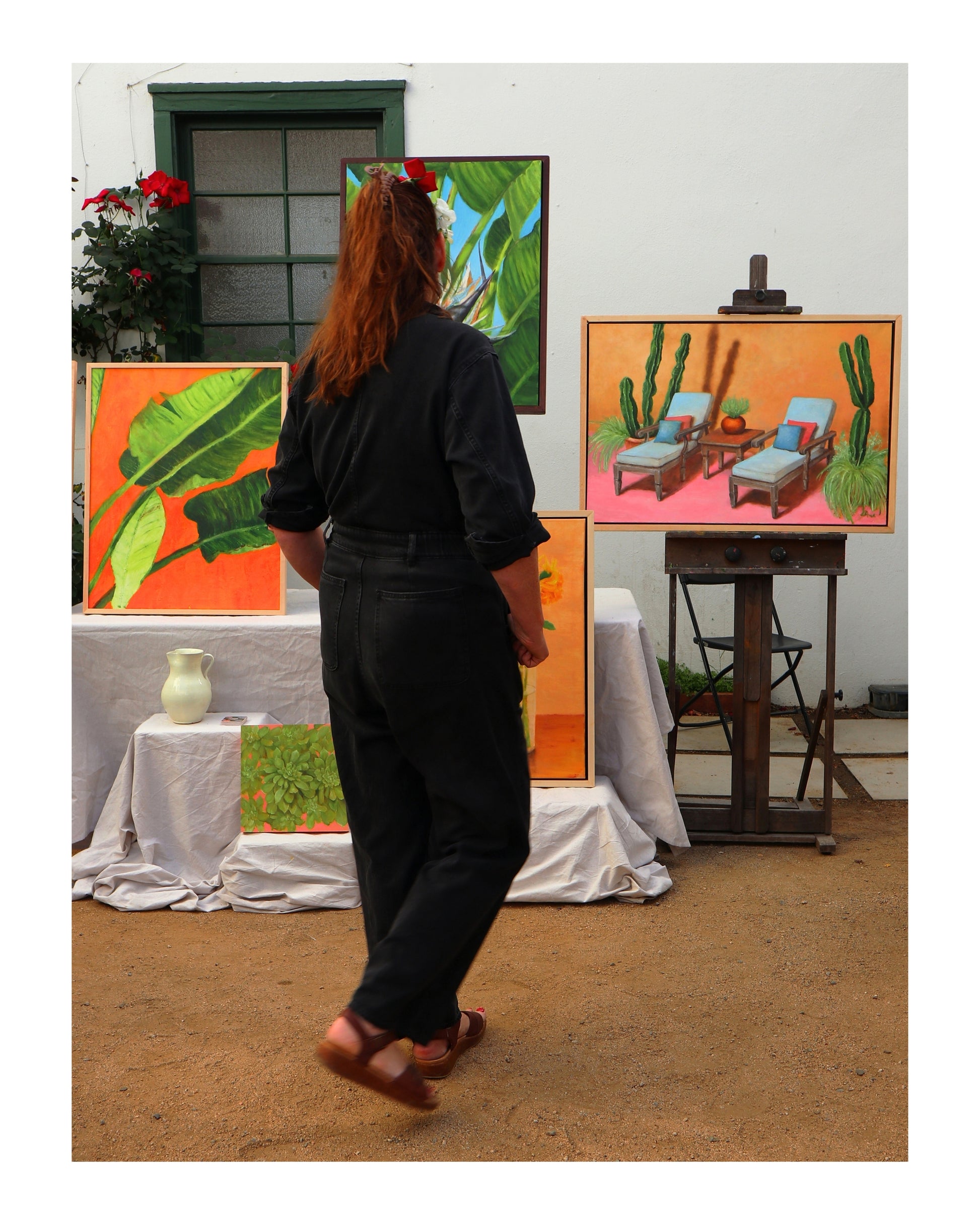Two lounger chairs recline between pots of cacti in the artist's backyard in Los Angeles.