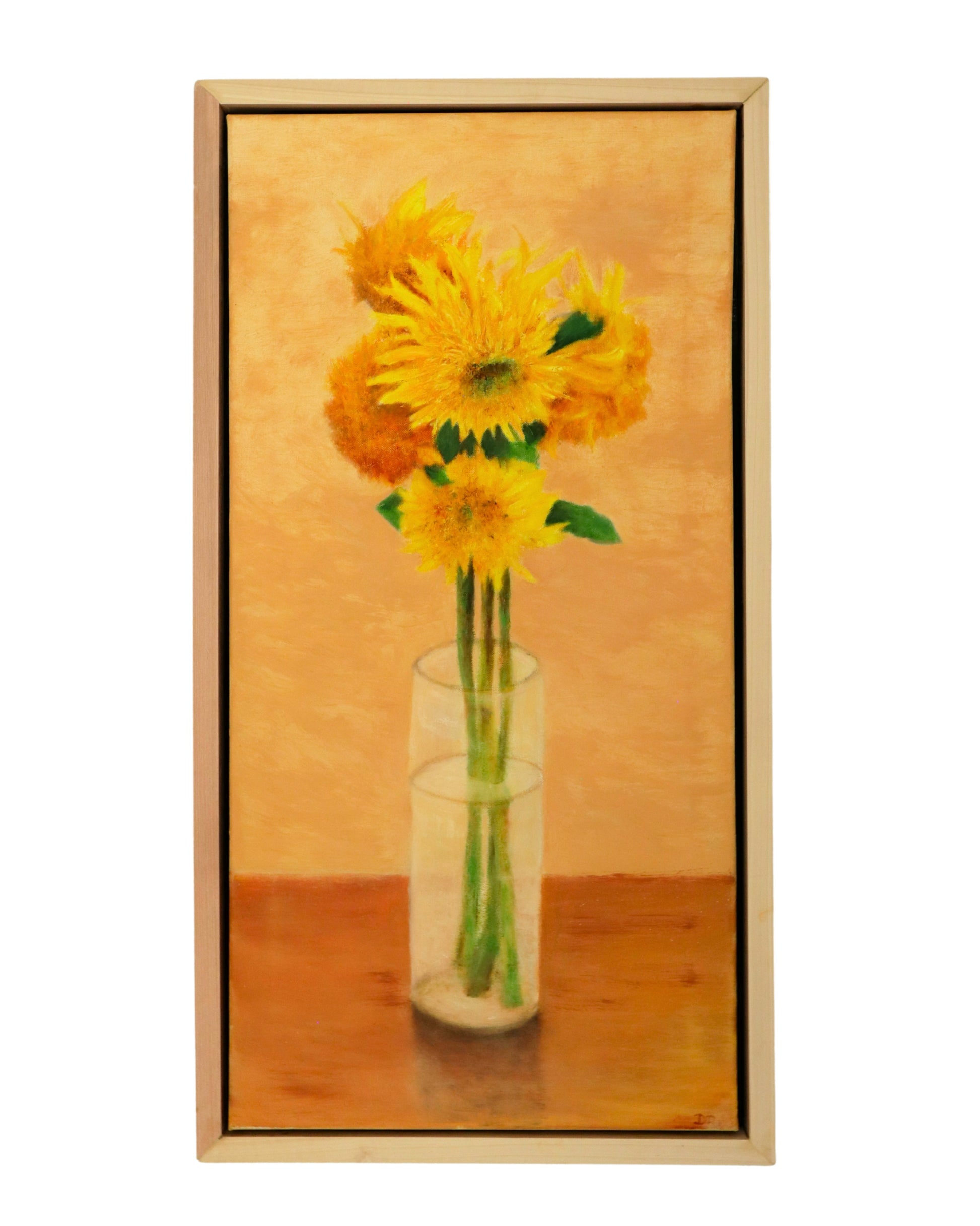 Sunflowers sit in a glass vase, with a muted tan background. Flowers are soft and ethereal. Oil paint on canvas, 15" x 30"